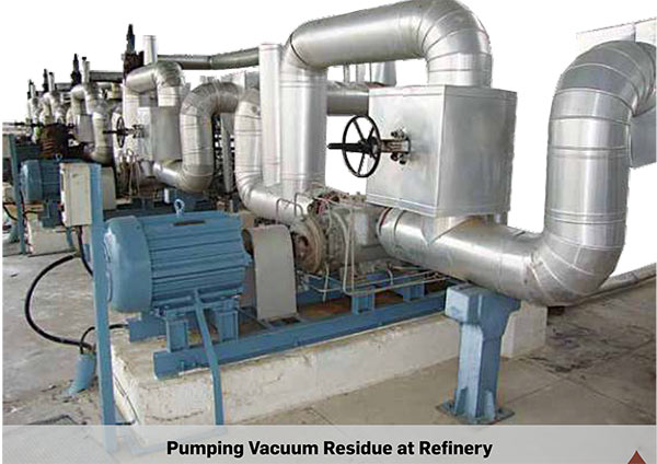 The highly viscous fractionated atmospheric residue is transported from the atmospheric distillation tower (ADU) to the vacuum distillation tower (VDU). Due to very low pressure, heavy materials are vaporized temperatures under cracking conditions. High amount of light & middle ractions of gas oils , fuel oils and a residue (Vacuum Bottoms) are removed from the fluids, resulting in increase of viscosity of vacuum residue in feedstock. A twin screw pump is used at the location.